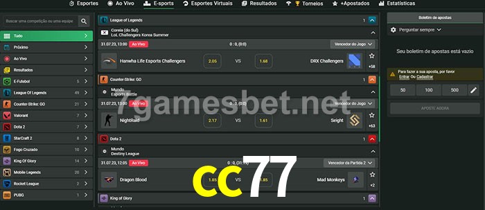 O cc77 oferece uma grande seleção de opções de apostas em e-sports com probabilidades competitivas